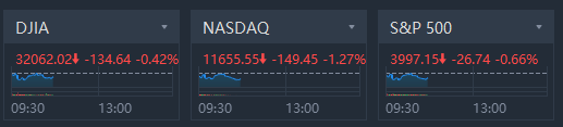 U.S. stocks remained depressed in morning trading. Nasdaq Index fell 1.29%, while Dow Jones, S&P 500 fell 0.42% and 0.66% separately.
