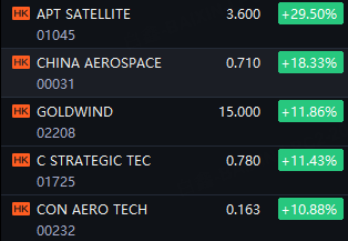 HK commercial aerospace stocks shined. APT Satellite soared 30%; China Aerospace surged 18%; Goldwind, C Strategic Tec and Con Aero Tech up 11%.
