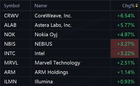 Nvidia-related stocks rallied in morning trading. CoreWeave rose 7%; Astera Labs rose 6%; Nokia rose 5%; Nebius, Intel, and Marvell Technology rose 3%; ARM Holdings rose 1%.