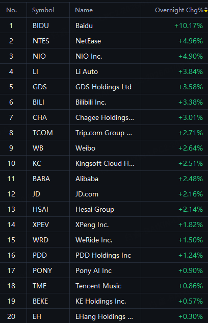 Chinese ETFs and ADRs shined in overnight trading. Baidu up 10%; CWEB and YINN up 6%; Netease and Nio up 5%; Li Auto up 4%; KWEB, GDS and Bilibili up 3%; Alibaba, JD, Trip.com and XPeng up 2%.