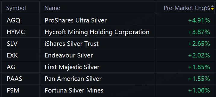 Gold, silver stocks and ETFs rose in premarket trading. ProShares Ultra Silver rose 5%; Hycroft Mining rose 4%; iShares Silver Trust rose 3%; Endeavour Silver, First Majestic Silver, and Pan American Silver rose 2%; Fortuna Silver Mines rose 1%.