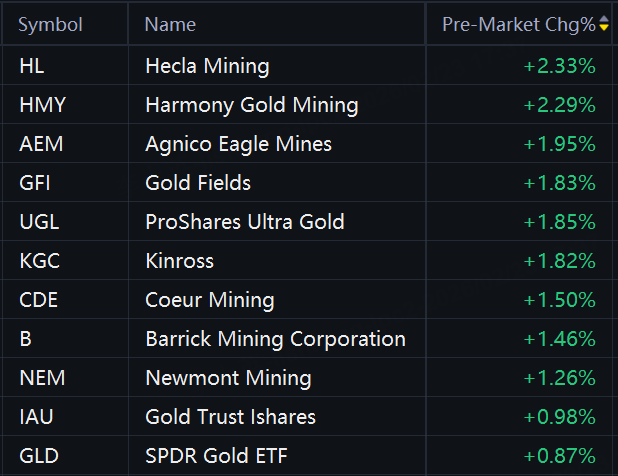 Hecla Mining, Harmony Gold , Agnico Eagle Mines, ProShares Ultra Gold, Kinross, and Coeur Mining rose 2%; Barrick Mining, Newmont Mining, and Gold Trust Ishares rose 1%.