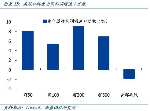 从重仓股看美股机构的选股偏好,相比于利润增速,美股机构更注重ROE。美股机构重仓股的ROE水平普遍较高,前50大重仓股的ROE高达26.1%,前100、前300、前500的ROE逐渐降低,但仍显著高于全部美股的ROE水平;而机构对于重仓股利润增速的偏好相对较低,利润增速中位数并非有序回落,机构更加注重长期增长的确定性。