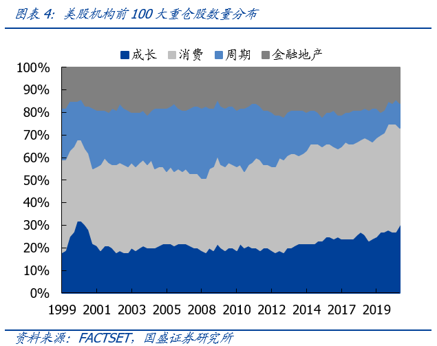 美股机构投资者抱团消费与成长。美股机构投资者前100大重仓股集中在消费与成长,消费与成长风格的机构重仓股数量占比与持股市值占比始终高于50%,是机构投资者主要的抱团方向。抱团风格在过去二十年中并非稳定不变,2000年至2007年,机构阶段性加仓金融地产和周期,但自2007年至今,机构则重新增配消费与科技,且个股数量与市值占比大幅上升,目前消费与成长的市值占比已超八成。