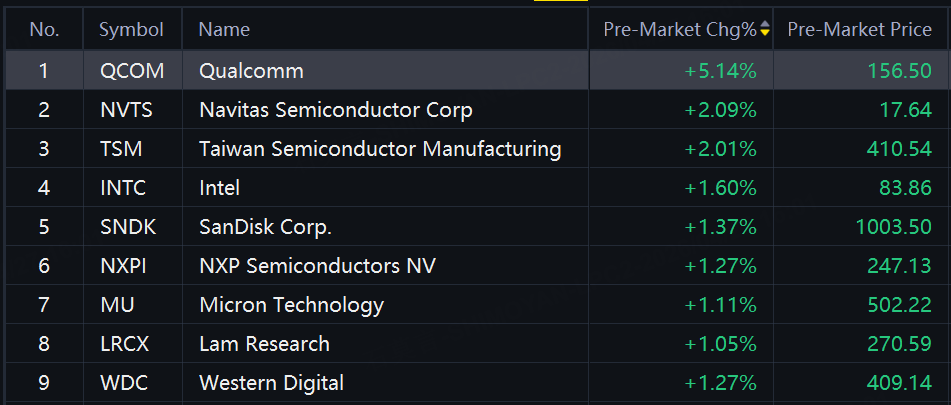 Some chip, storage stocks rallied in premarket trading. Qualcomm up 5%; Navitas, TSMC up around 2%; Intel, SanDisk, NXPI, Micron, Lam Research, Western Digital up over 1%.