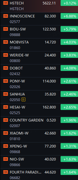 HSTECH turned positive in afternoon trading. Innscience up 7%; Baidu up 6%; Mobvista, Dobot and Weride up 4%.