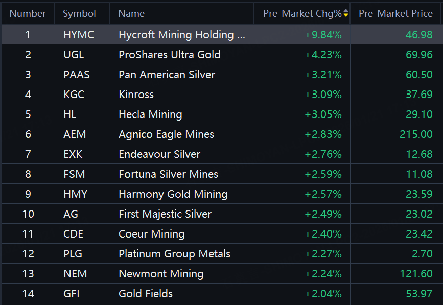 Hycroft Mining up about 10%; ProShares Ultra Gold up over 4%; Pan American Silver, Hecla Mining up over 3%; Agnico Earle Mines, Endeavour Silver up over 2%.