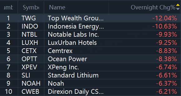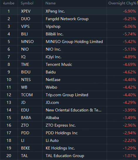 Chinese ADRs and ETFs slide in overnight trading with XPeng falling over 6%. China's consumer inflation rate fell in September, while producer price deflation deepened, even as Beijing rolls out more stimulus measures in a bid to revive flagging demand and shaky economic activity.