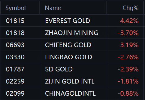 Gold stocks pulled back in Hong Kong. Everest Gold and Zhaojin Mining fell 4%; Chifeng Gold and Lingbao Gold fell 3%; SD Gold and Zijin Gold Intl rose 2%.