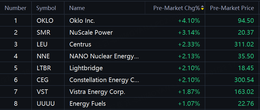Nuclear stocks gained in premarket trading with Oklo up 4%; NuScale Power up over 3%; Centrus, NANO Nuclear Energy, Lightbridge up over 2%.