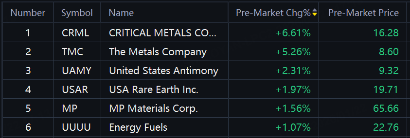 Rare earth stocks rose in premarket trading. Critical Metals up over 6%; The Metals up over 5%; UAMY, USA Rare Earth up around 2%.
