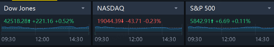 The Dow Jones Industrial Average rose 221.16 points, or 0.52%, to 42,518.28, the S&P 500 gained 6.69 points, or 0.11%, to 5,842.91 and the Nasdaq Composite lost 43.71 points, or 0.23%, to 19,044.39.
