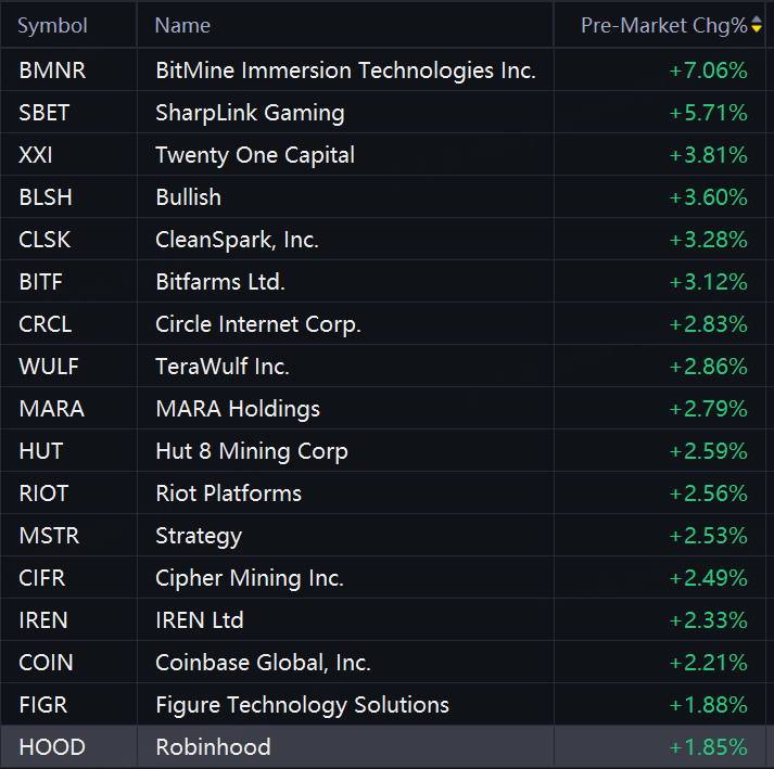 Crypto stocks jumped in premarket trading. BitMine rose 7%; SharpLink Gaming rose 6%; Bullish rose 4%; CleanSpark, Bitfarms, Circle, MARA Holdings, Riot Platforms, and Strategy rose 3%; Cipher Mining, IREN, Coinbase, and Robinhood rose 2%.