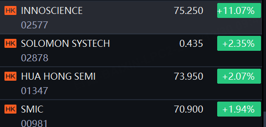 HK Chip stocks rose. INNOSCIENCE up 11%; SOLOMON SYSTECH, Hua Hong Semiconductor and SMIC up 2%.