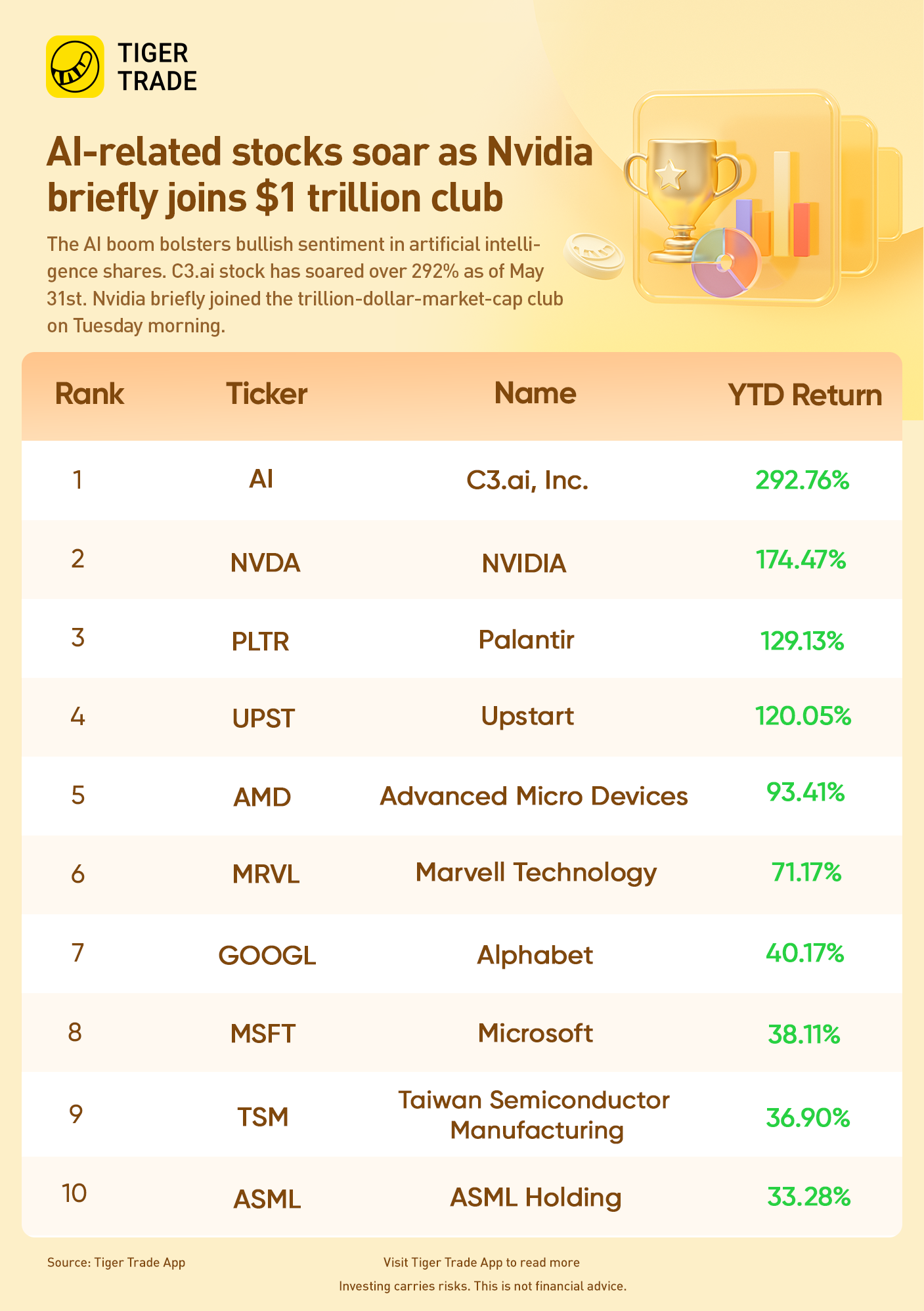 The AI boom bolsters bullish sentiment in artificial intelligence shares. C3.ai stock soared over 33% on Tuesday as Nvidia briefly joined the trillion-dollar-market-cap club on Tuesday morning. Meanwhile, year-to-date return of C3.ai reached over 292%.