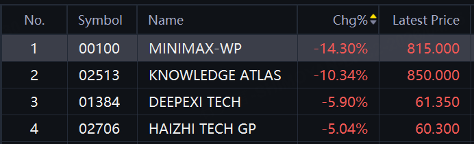 AI application software shares fell in Hong Kong market. MiniMax down over 14%; Knowledge Atlas down over 10%; Deepexi Tech down 6%; Haizhi Tech down 5%.