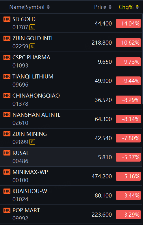 SD Gold down 14%; Zijin Gold down about 11%; CSPC Pharma down about 10%; Tianqi Lithium down over 9%; China Hongqiao, Zijin Mining down around 8%.