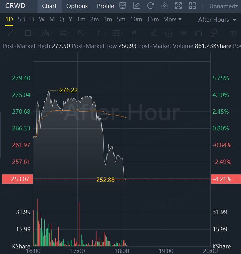 CrowdStrike shares rose slipped 4% in extended trading on Wednesday.