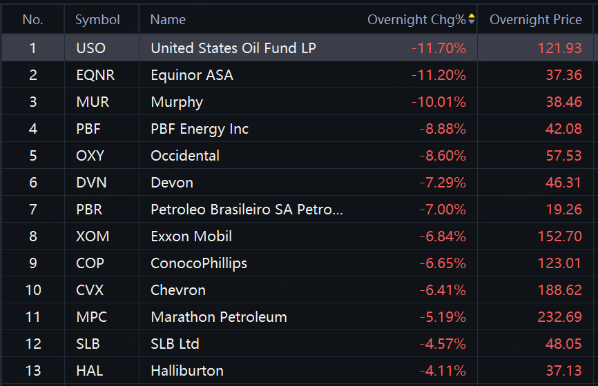 Oil stocks and ETFs tumbled in overnight trading. USO, Equinor down over 11%; Murphy down 10%; Occidental down over 8%; Devon, PBR up over 7%; Exxon Mobil, Chevron down over 6%.