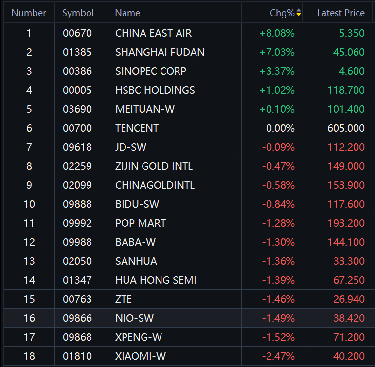 In terms of star stocks, China East Air jumped 8%; Shanghai Fudan gained 7%; Sinopec Corp up over 3%; Alibaba, NIO down over 1%; Xiaomi down over 2%.