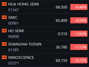 Chip Stocks Dropped. Hua Hong Semi Down 6%; SMIC Down 5%; HG Semi And Shanghai Fudan Down 1%.