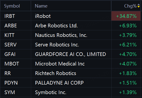 Robot stocks jumped in morning trading. iRobot rose 35%; Arbe Robotics rose 7%; Serve Robotics rose 6%; Guardforce AI rose 5%; Microbot Medical and Nauticus Robotics rose 4%; Richtech Robotics and Palladyne AI rose 2%; Symbotic rose 1%.