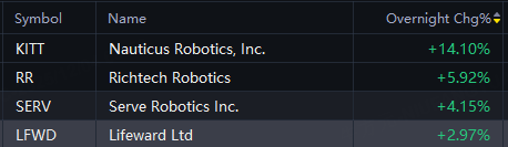 Robotics stocks jumped in overnight trading. Nauticus Robotics up 14%; Richtech Robotics up 6%; Serve Robotics up 4%.