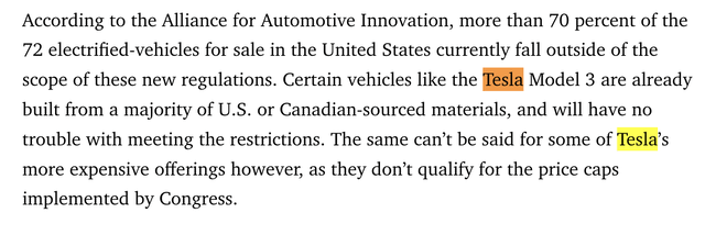 This past Sunday, the U.S. Senate passed the Inflation Reduction Act, a spending bill containing a variety of climate change related measures. Among the most discussed measures in the bill is a change to the electric vehicle (“EV”)tax credit. Under previous rules, a company would lose its eligibility for EV credits after selling its 200,000th car. Tesla (NASDAQ:TSLA) crossed the 200,000 car threshold in 2018, and its tax credits were phased out over three years. By early 2022, Teslas were no longer eligible for the tax credit.