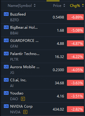 Major AI stocks remained low in morning trading following Palantir’s Q2 results; Buzzfeed and BigBear.ai Holdings fell over 5%.
