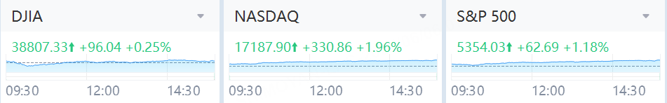 The S&P 500 gained 62.69 points, or 1.18%, to end at 5,354.03, while the Nasdaq Composite rose 330.86 points, or 1.96%, to 17,187.90. The Dow Jones Industrial Average rose 96.04 points, or 0.25%, to 38,807.33.