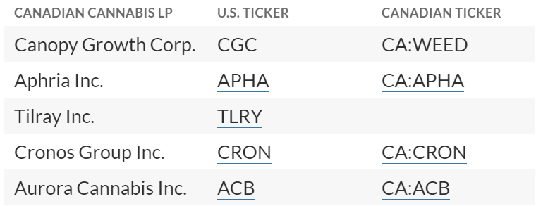 The Canadian licensed producers (known as LPs) do not sell cannabis products in the U.S. because it is against U.S. law. But shares of the largest five are listed on the Nasdaq exchange or the New York Stock Exchange: