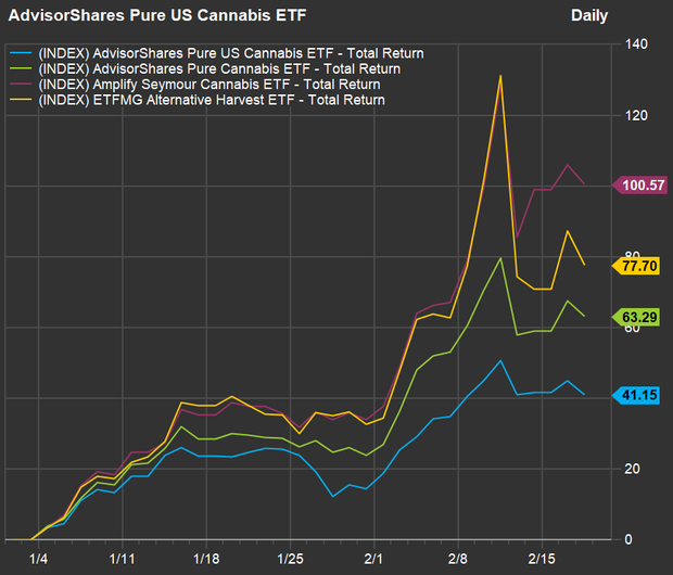 All have made dramatic upward moves this year, but you can see that CNBS has doubled, followed by MJ and the two AdvisorShares ETFs.