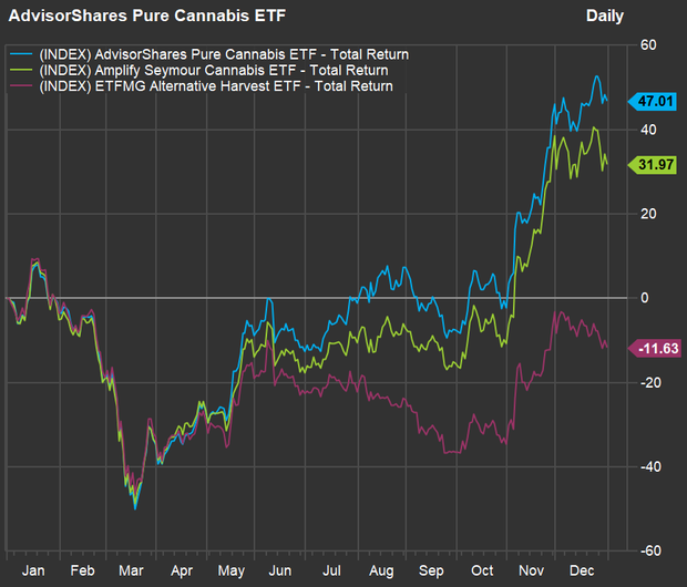 The AdvisorShares Pure US Cannabis ETF (MSOS) was established in September 2020. So this next chart compares total returns for the other three ETFs during 2020: