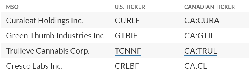 Meanwhile, the four largest U.S. companies selling marijuana products in states (and Washington D.C.) where recreational use is legalaren’tlisted on U.S. exchanges because they are engaged in activities that are technically illegal on the federal level. They are listed over the counter. These companies are known as multistate operators (MSOs):