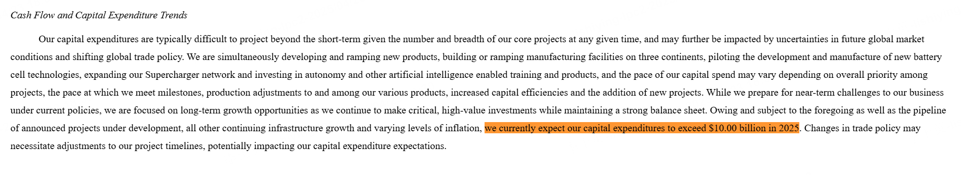 Tesla said it expected capital expenditures to exceed $10 Bln in 2025, SEC Filed on Wednesday.