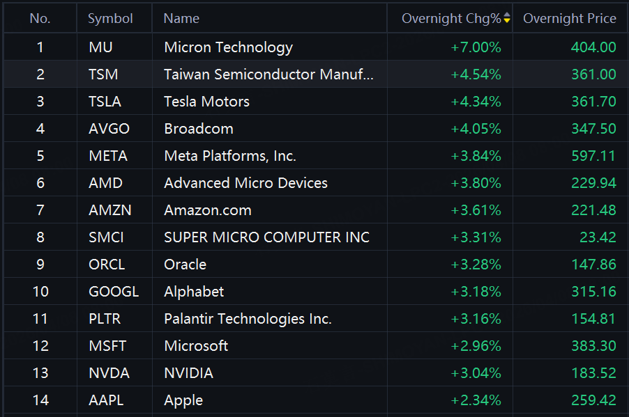 Big tech stocks rebounded in overnight trading. Micron up 7%; TSMC, Tesla, Broadcom, Meta, AMD up around 4%; Amazon, SMCI, Alphabet up over 3%.