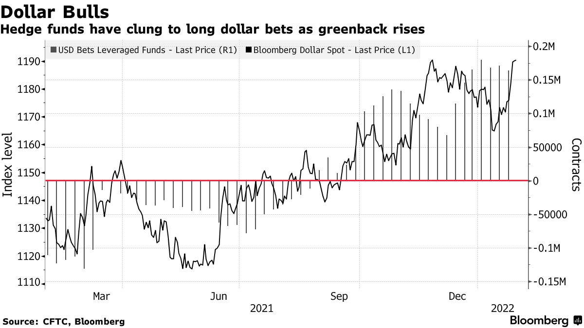 在上周美联储主席鲍威尔的鹰派讲话之后,市场对今年加息5次的预期一直在升温,并引发了做多美元的押注,上周美元指数自2020年7月以来首次站上87关口。富国银行Mike Schumacher等策略师表示: