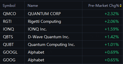 Rigetti Computing, QMCO, IONQ up 2%; QBTS, QUBT up 1%.