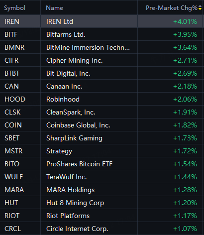 Bitfarms, BMNR, Iren up 4%; Coinbase, SBET, Strategy up 2%.