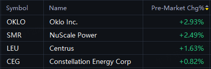 Oklo up 3%; NuScale Power, Centrus up 2%; Constellation Energy up 1%.