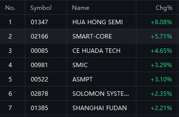 HK Chip Stocks Rally. Hua Hong Semi up 8%; Smart-Core up 6%; CE Huada Tech up 5%; SMIC and ASMPT up 3%; Soloman Systech And Shanghai Fudan up 2%.