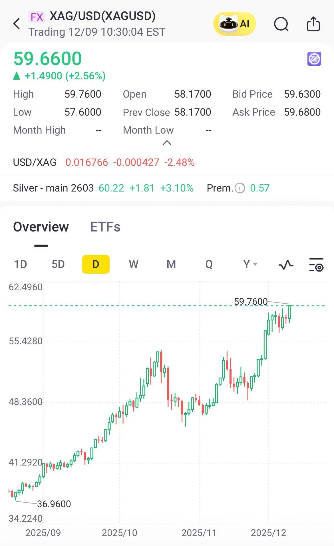 Spot silver rises 2.6% to $59.66 per ounce, hitting record high. Prices rise as investors position for an expected December Federal Reserve rate cut and looked for signs of whether policymakers will outline a slower easing path when their two-day meeting begins later in the day.