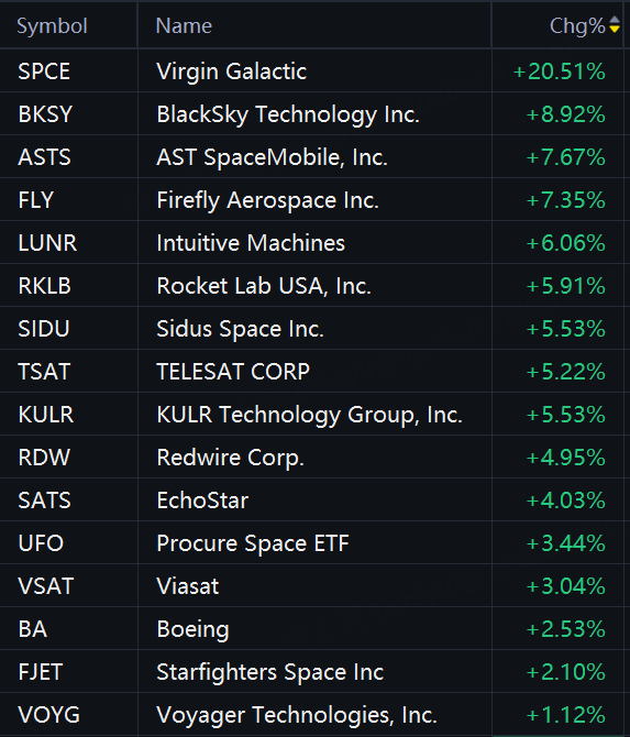 Space stocks jumped in morning trading. Virgin Galactic rose 21%; BlackSky Technology rose 9%; AST SpaceMobile rose 8%; Firefly Aerospace rose 7%; Intuitive Machines, Rocket Lab, Sidus Space, and KULR Technology rose 6%; Telesat and Redwire rose 5%; EchoStar rose 4%; Procure Space ETF, Viasat, and Boeing rose 3%.