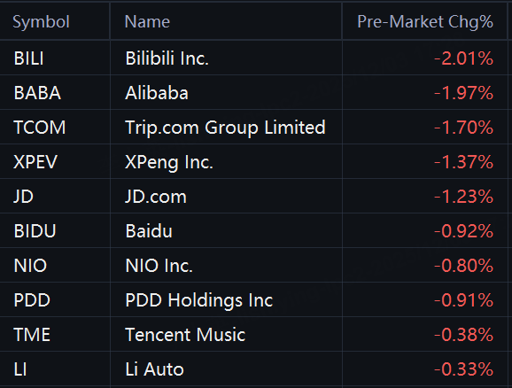 Bilibili, Alibaba, and Trip.com fell 2%; XPeng, JD.com, and Baidu fell about 1%.