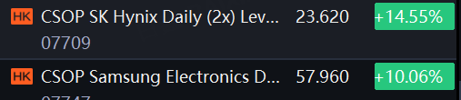 CSOP SK Hynix Daily 2x Leveraged Product surged over 14% after local media said the company is the sole supplier of advanced memory for Microsoft Corp.’s new artificial intelligence chip. CSOP Samsung Electronics Daily 2x Leveraged Product jumped over 10%.