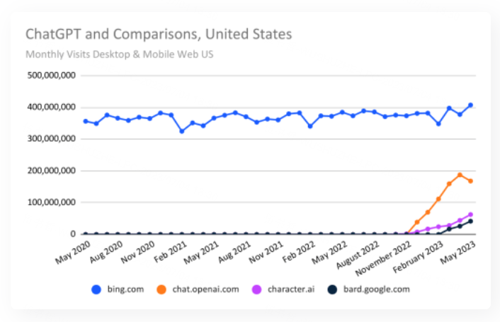 ChatGPT still attracts more worldwide visitors than bing.com, Microsoft’s search engine, or Character.AI, the second most popular stand-alone AI chatbot site. Worldwide visits to Character.AI dropped 32% month-over-month, although traffic is still up tremendously from where it was in June 2022, when the company founded by ex-Google engineers was just getting started.