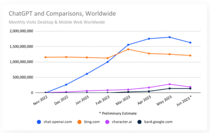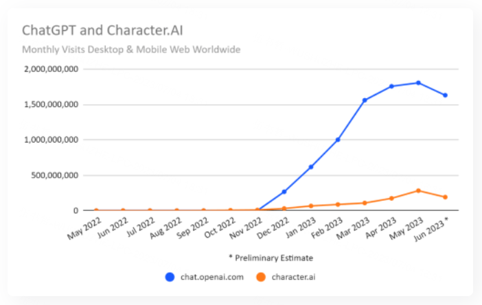 Another AI chatbot site that had seen a rapid rise in the past few months was Character.AI, a playful site that has chatbots take on the personalities of celebrities, historical figures, and fictional characters. The website began to grow much more rapidly after ChatGPT attracted much more attention to AI chatbots in general, but its traffic volume also fell in June.