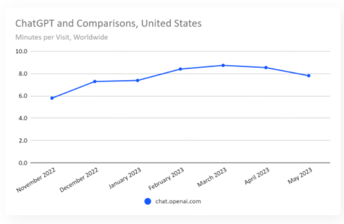 Worldwide unique visitors to ChatGPT’s website dropped 5.7%. The amount of time visitors spent on the website was also down 8.5%.