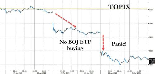 Something happened on Tuesday that hasn't happened since 2016: Japan's Topix index (which is widely viewed as more representative of Japanese equities than the Nikkei) tumbled by 1.2% in the morning session.... and the BOJ did not intervene.