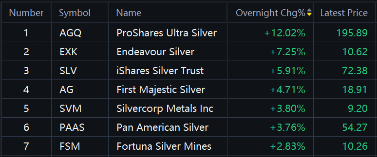 Silver stocks and ETFs rose in overnight trading. AGQ surged 12%; Endeavour Silver up over 7%; SLV up 6%; First Majestic Silver up about 5%.